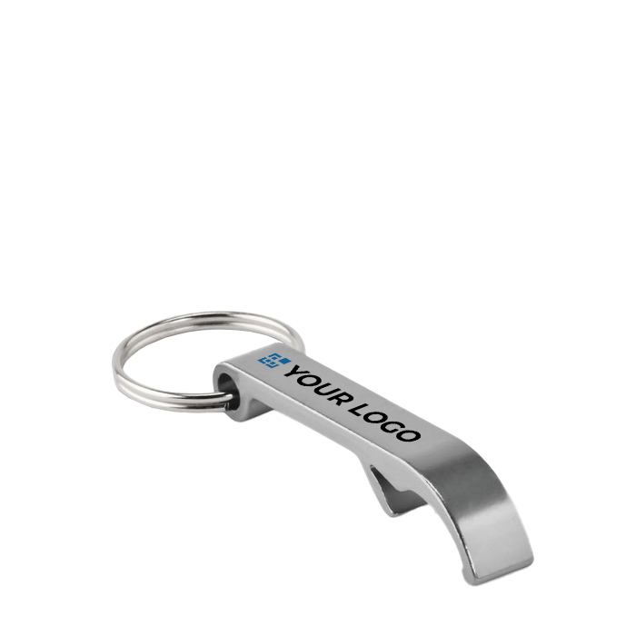 Flessenopener met sleutelhanger gemaakt van gerecycled aluminium in een glanzende afwerking.