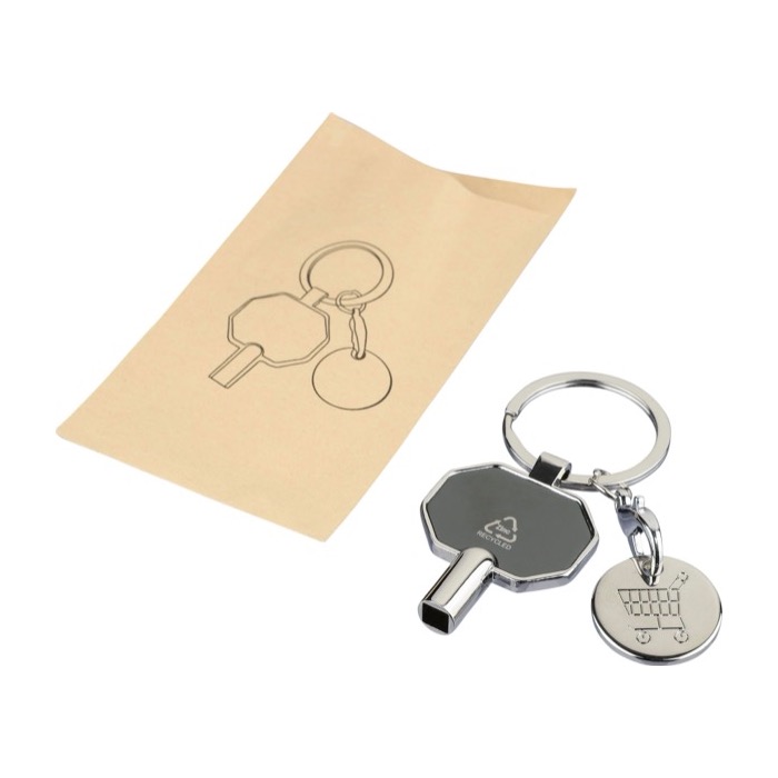 Sleutelhanger van gerecyclede zinklegering met radiatorontluchter en winkelmuntje, bedoeld voor dagelijks gebruik in professionele omgevingen. Voorzien van een vierkantsleutel van 5x5mm, een gangbare maat in Europa voor radiatoronderhoud, en een stevige metalen ring om hem aan sleutels of toegangspassen te dragen. Met recyclagelogo en geleverd in een individuele papieren hoes, in een bruine kartonnen envelop met illustratie. Geschikt voor onderhoudscampagnes, technische beurzen of merkacties op locatie.