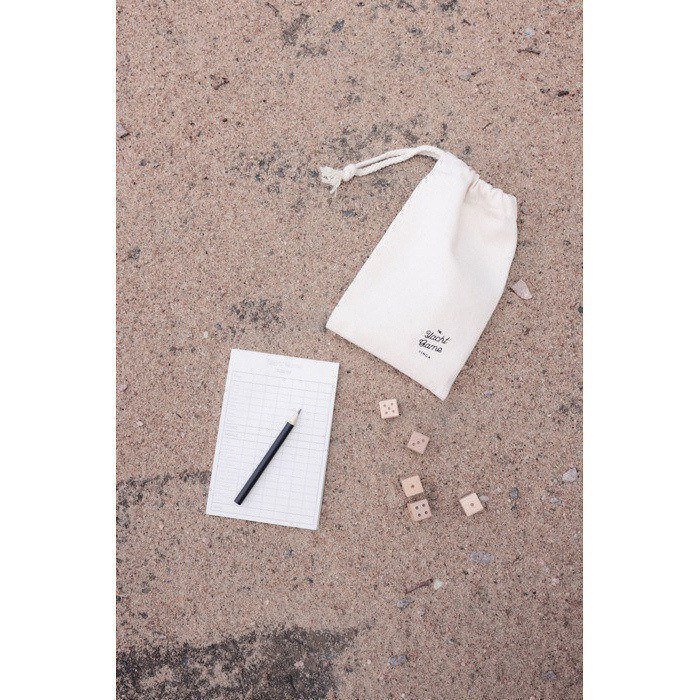 Een tijdloos spel dat perfect is voor luie dagen in de tuin, op het strand of tijdens zomerse picknicks – en waarom niet ook tijdens je lunchpauze op het werk? Het doel is simpel: scoor zoveel mogelijk punten door dobbelstenen op verschillende manieren te werpen en te combineren. Het spel bevat vijf standaarddobbelstenen van FSC®‑gecertificeerd grenenhout en een notitieblokje met pen om de score bij te houden. Alles zit in een praktische katoenen zak, waardoor je het gemakkelijk overal mee naartoe neemt. Een handleiding is inbegrepen.