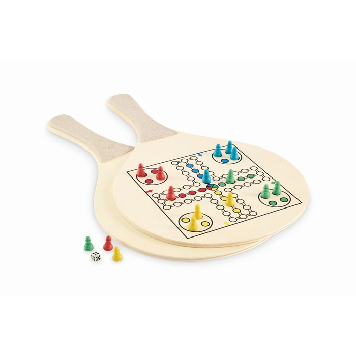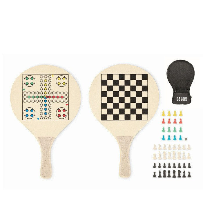 Set strandrackets van multiplex met geïntegreerde schaak- en parchisborden. Inclusief één TPR-bal, dobbelstenen en speelstukken om de spellen compleet te maken. Geleverd in een RPET-mesh tas met ritssluiting voor eenvoudig opbergen en vervoeren. Een veelzijdige optie voor zomerse promotieacties, bedrijfsuitjes of outdoor evenementen.