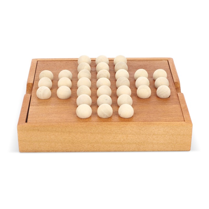 Houten solitairspel met knikkers dat je geest uitdaagt. Transformeert van doos naar speelbord en stimuleert creativiteit en kritisch denken.