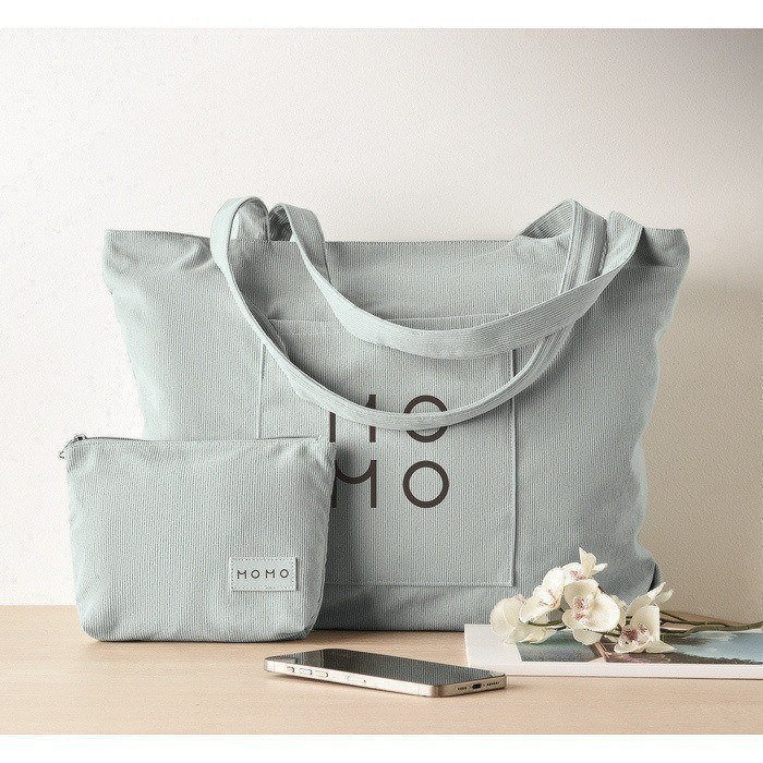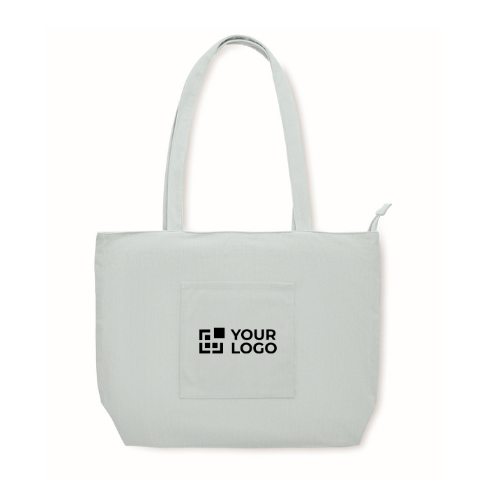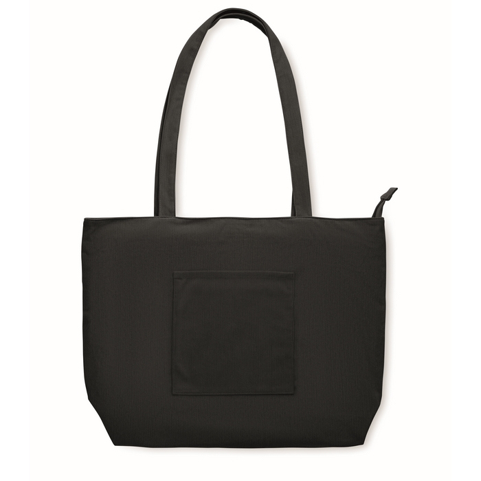 Grote winkel- of strandtas van ribfluwelen polyester van 220 g/m², ontworpen voor dagelijks gebruik met ruime inhoud. Voorzien van een bovenrits om de inhoud tijdens transport beschermd te houden. Inclusief een open voorvak om de meest gebruikte items binnen handbereik te hebben en een binnenvak om sleutels, mobiel of documenten te organiseren. Praktische optie voor welkomstpakketten, interne evenementen of merchandisingacties in winkels.