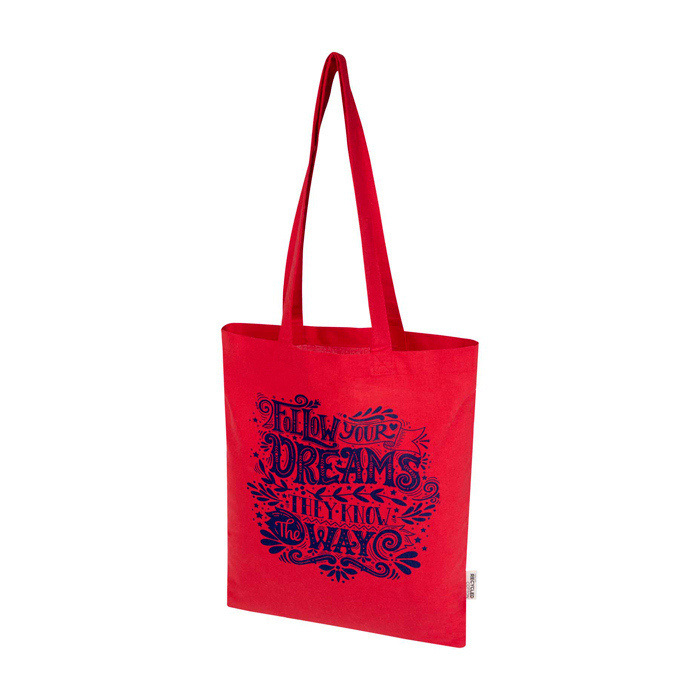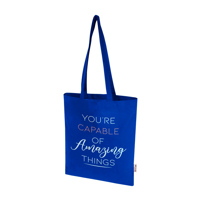 De Madras Blend tas, gemaakt van 60% GRS-gecertificeerd gerecycled katoen en 40% GRS RPET, is de perfecte tas om uit te delen tijdens evenementen, conferenties of te gebruiken als boodschappentas voor kleine boodschappen. Dankzij de katoendichtheid van 140 g/m² is de tas stevig, duurzaam en geschikt om zware items in het hoofdvak te dragen. Met de 30 cm lange schouderbanden is deze tas gemakkelijk mee te nemen. De beschikbare drukmethodes voor deze tas zijn ook GRS-gecertificeerd, wat zorgt voor een transparante en gecertificeerde supply chain. Gemaakt in India. Belastbaar tot 5 kg. Inhoud: 7 liter.
