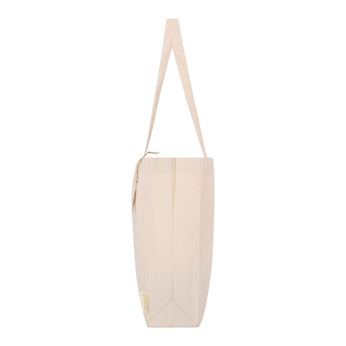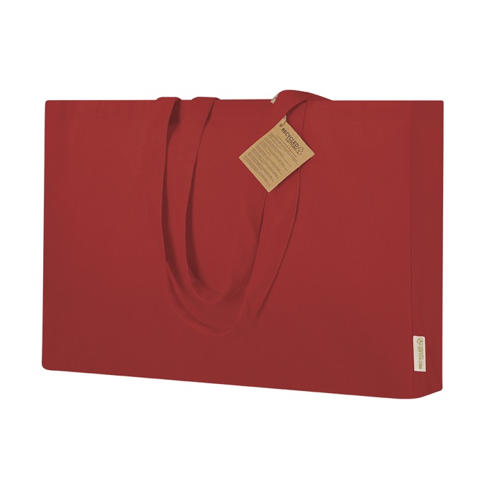Tas met vouw in bodem en zijkanten, vooral gemaakt van gerecycled katoen van 220g/m² voor herhaald gebruik in het dagelijks leven. Hij heeft verstevigde lange hengsels van 70 x 2,5cm, bedoeld om hem comfortabeler en steviger over je schouder te dragen. Inclusief zichtbaar label van gerecycled katoen om het materiaal te herkennen. Draagt tot 10kg, geschikt voor beurzen, trainingen of het uitdelen van bedrijfsmateriaal op kantoor.