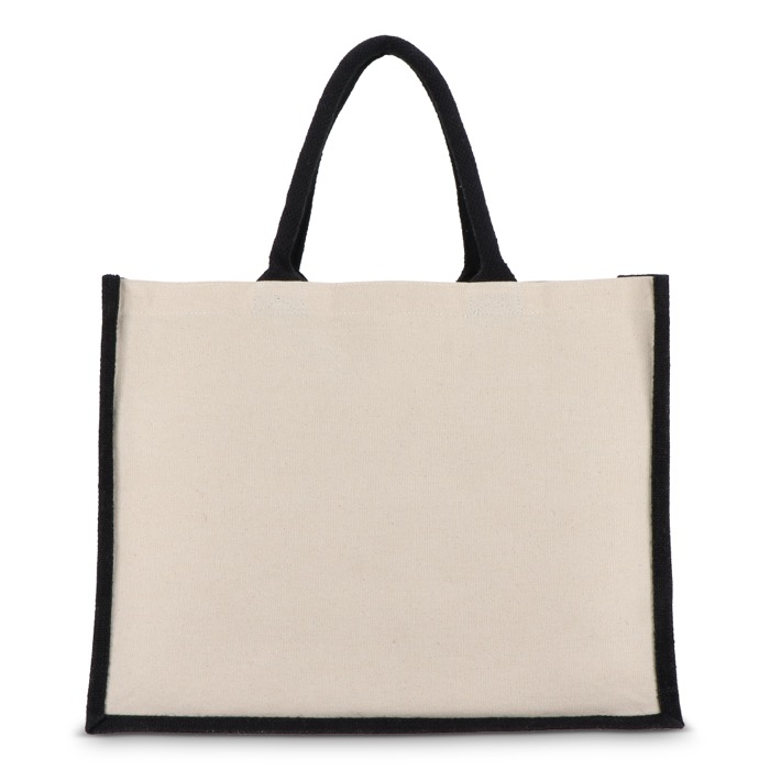 Elegante tas met voor- en achterpanelen van katoenen canvas en zij- en onderpanelen van jute (320 g/m²). Afgewerkt met katoenen hengsels en contrasterende zijpanelen voor extra visuele uitstraling. Oeko-Tex® gecertificeerd. Ideaal voor winkels, events of dagelijks gebruik.
