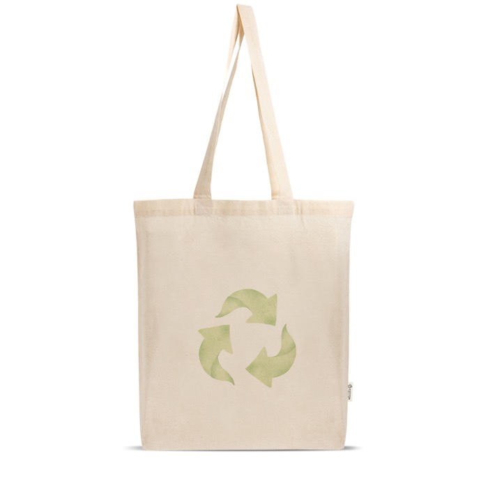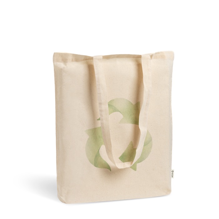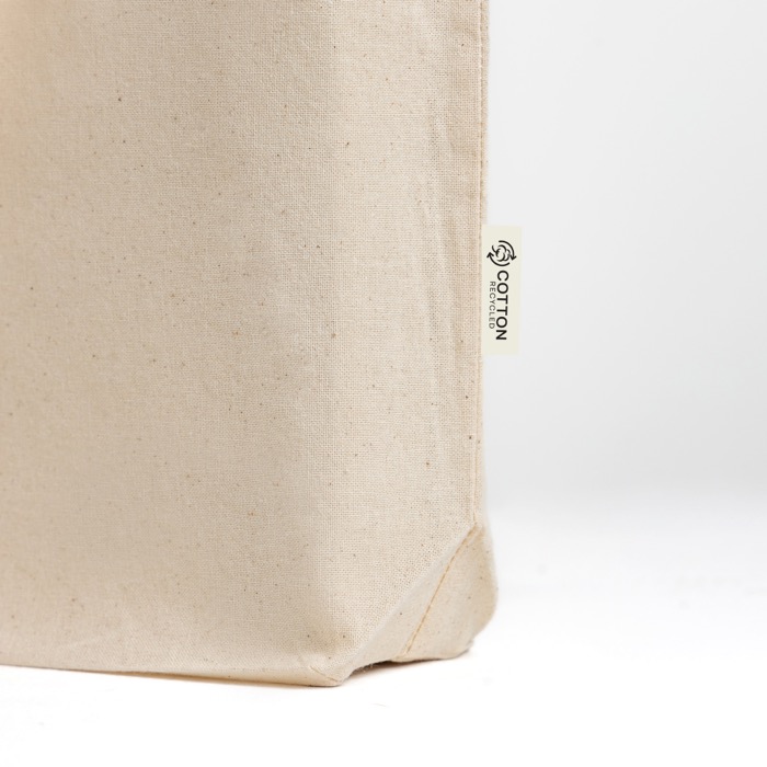 Tas van gerecycled katoen en gerecycled plastic, met een bodemvouw voor meer inhoud en extra stabiliteit wanneer je hem op de grond zet. Met lange hengsels om comfortabel over je schouder te dragen en een draagkracht tot 9kg. Ideaal voor dagelijks gebruik: boodschappen, boeken of werkmateriaal. De stof van 140g biedt een goede balans tussen lichtheid en duurzaamheid, zodat je hem steeds opnieuw kunt gebruiken. Een praktische optie voor beurzen, streetmarketingacties en het uitdelen van bedrijfsdocumentatie.