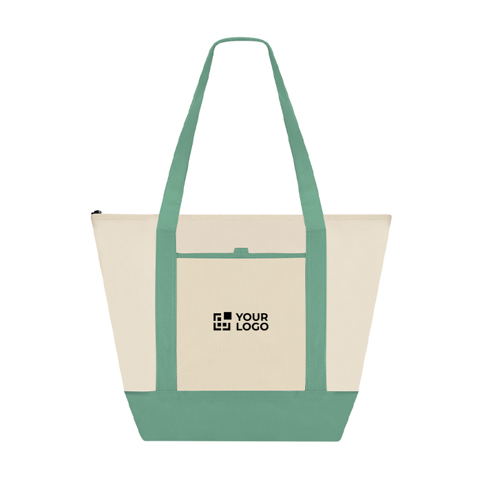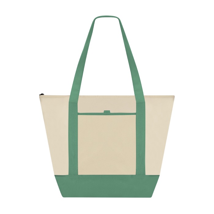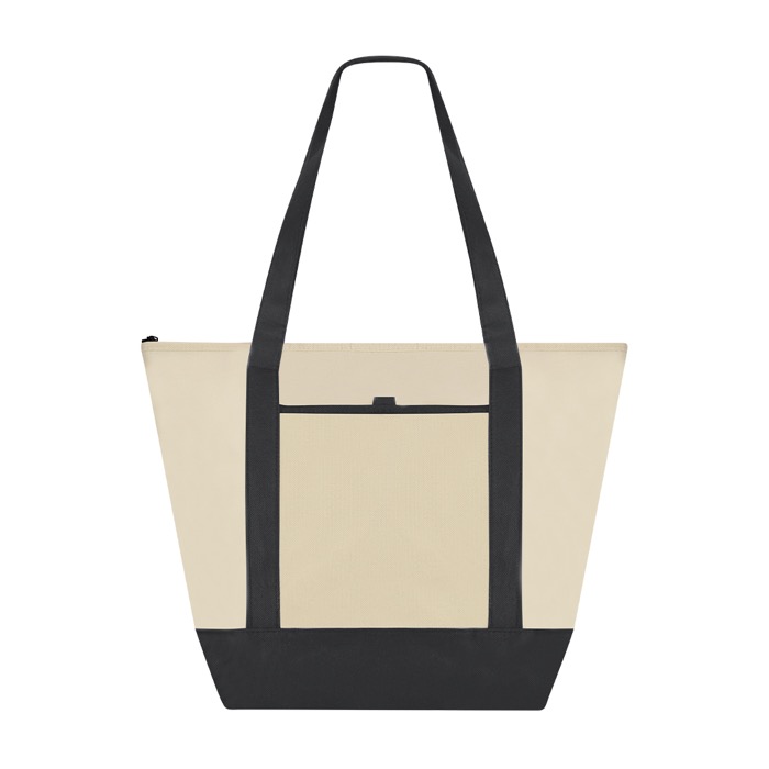 Koeltas van non-woven stof, bedoeld om eten en drinken mee te nemen tijdens korte verplaatsingen. Hij heeft een ritssluiting zodat de inhoud beschermd blijft en een binnenkant met aluminium afwerking die helpt de temperatuur langer te behouden. De verstevigde middellange hengsels van 60 cm maken dragen makkelijk. De bodemvouw geeft extra ruimte en zorgt voor meer stevigheid. Er is een open voorvak voor snelle toegang en hij draagt tot 5 kg. Een praktische keuze voor merkacties op beurzen, op kantoor of bij events.