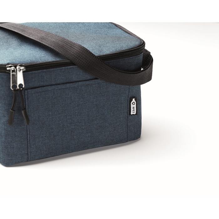 Duotone 600D RPET koeltas geschikt voor 6 blikjes. Isolatiemateriaal: 0,15mm PEVA + 3mm foam.