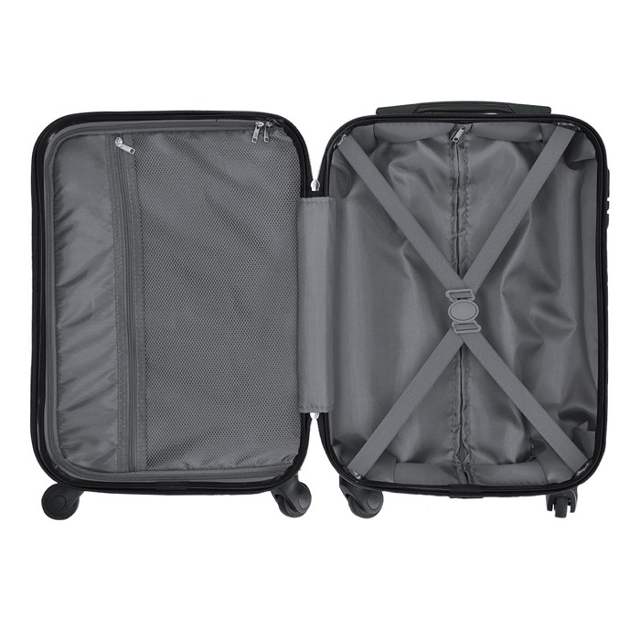 Trolley met harde kunststof schaal van hoge weerstand, bedoeld voor zakelijke reizen en frequente verplaatsingen. Hij heeft 4 wielen en een telescopische trekstang, zodat je hem makkelijk manoeuvreert op luchthavens of stations. Het hoofdvak heeft een dubbele rits en een zijslot met cijfercombinatie. Binnenin zit een bodemgedeelte met verticale rits en gekruiste elastische banden, plus een bovenvak met organiser-vakken. Handig voor zakenreizen, beurzen en salesteams.
