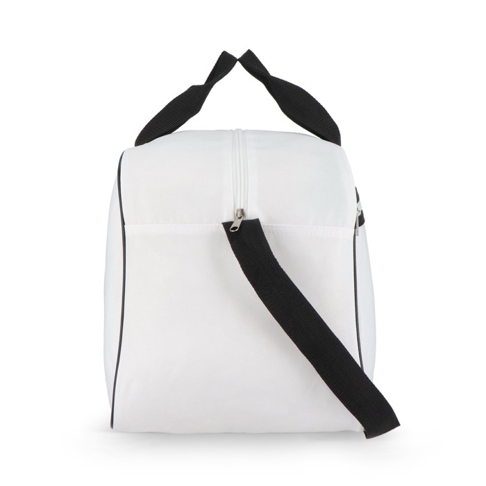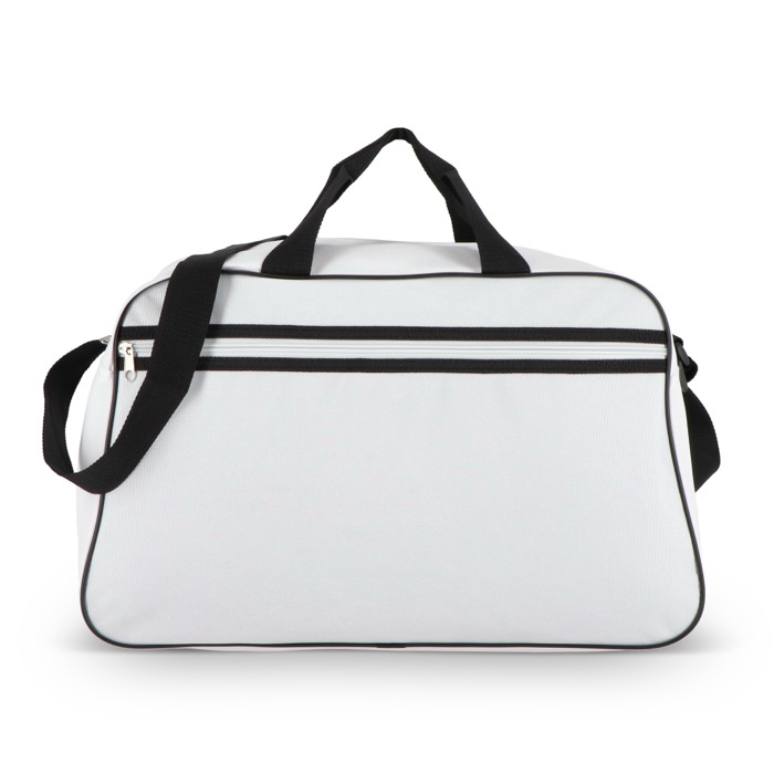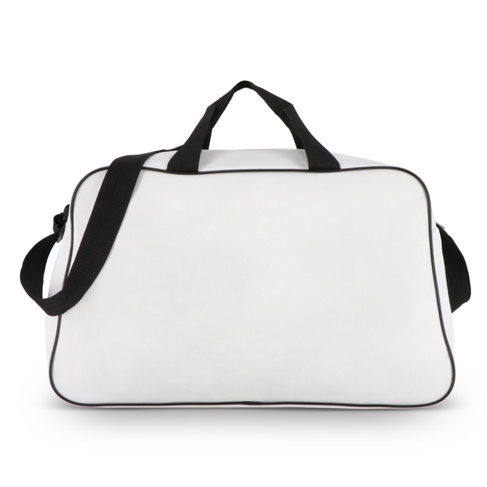 Reis- en sporttas van gerecycled plastic 600D, bedoeld voor veelvuldig gebruik onderweg en bij sportactiviteiten. Met een voorvak met rits om kleine spullen te scheiden en binnen handbereik te houden. Je draagt ’m met de korte handgrepen of met de lange, verstelbare schouderriem, passend bij verschillende routes en ladingen. De stevige stof helpt de vorm te behouden en de inhoud te beschermen. Een praktische optie voor toernooien, HR-acties of zakelijke geschenken met logo.