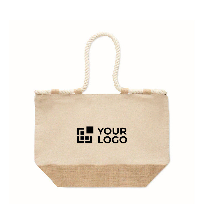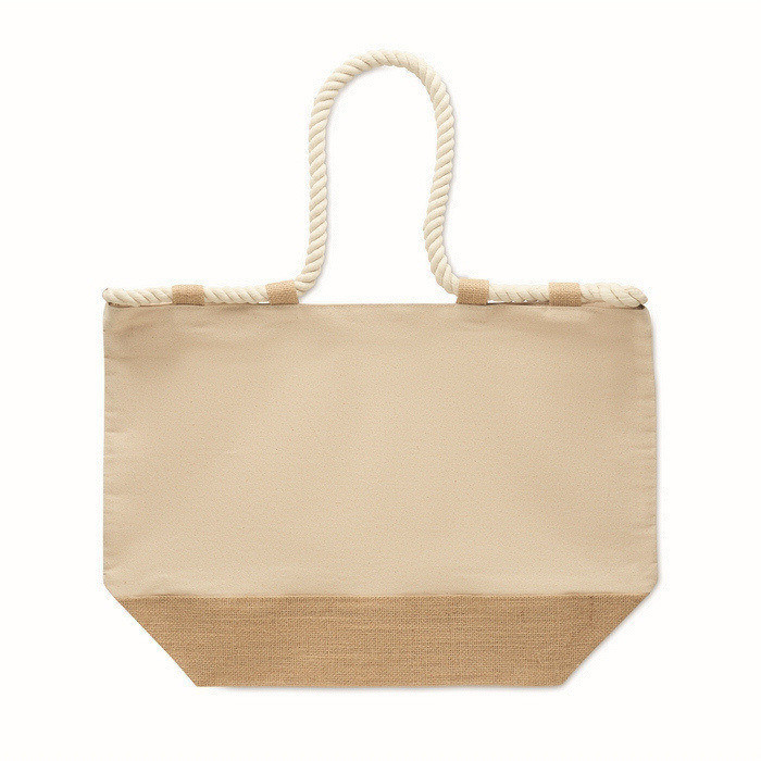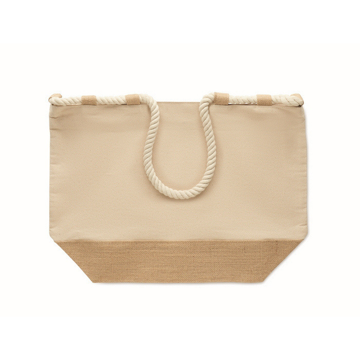Strandtas van katoencanvas van 280 g/m² gecombineerd met jute, ontworpen voor intensief gebruik in de zomer of bij buitenevenementen. Inclusief touwgrepen voor comfortabel dragen en een ritssluiting om de inhoud tijdens het vervoer te beschermen. De met jute beklede bodem biedt extra stevigheid bij het neerzetten en helpt de vorm te behouden. Voorzien van 10 jutelussen als praktisch en decoratief detail. Een handige optie voor welkomstpakketten, seizoenscampagnes of corporate merchandising.