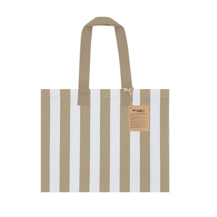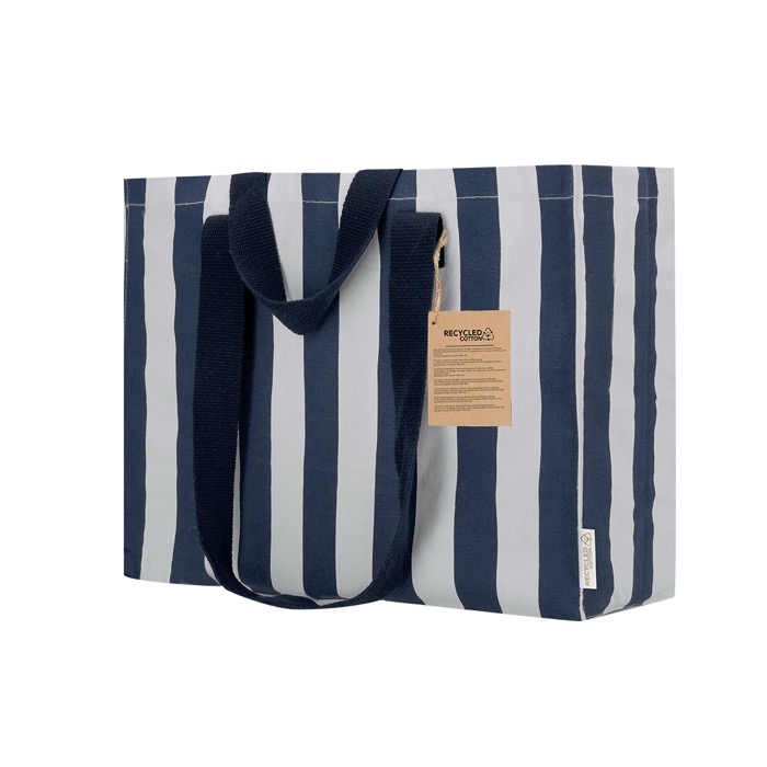 Gerecyclede katoenen tas van 310 g/m² met lange hengsels van 70 cm, extra verstevigd voor langdurig gebruik. De tas is netjes gestikt en heeft een vouwbodem aan de onderkant en zijkanten. Zo krijg je meer inhoud en blijft de vorm behouden als je hem vult. Met zijlabel en draagvermogen tot 10 kg, geschikt voor uitdelen op events of dagelijks gebruik op kantoor. Het ontwerp met witte verticale strepen in combinatie met kleur geeft een nette uitstraling voor merkacties en beurzen.