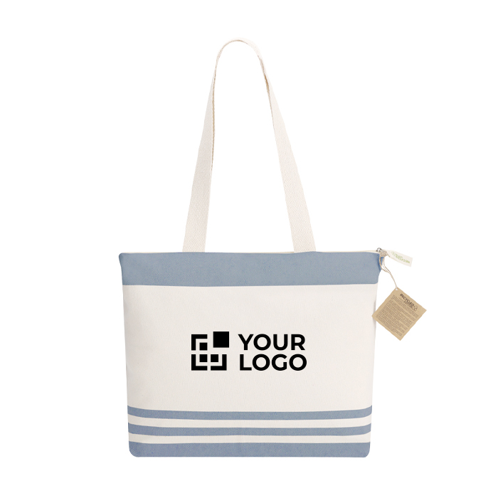 Tas van gerecycled katoen van 300g/m² in een natuurlijke tint, met een ontwerp van gekleurde horizontale strepen. Gemaakt voor dagelijks gebruik op beurzen en bij ontvangstpunten. Met een vouwbodem en zijvouwen voor extra inhoud en om beter in vorm te blijven wanneer je materialen meeneemt. Inclusief lange hengsels van 70cm met versteviging en zichtbare stiksels voor comfortabel dragen over je schouder. Netjes afgewerkt en met verzorgde details voor merkacties bij events, in retail of bij de onboarding van personeel.