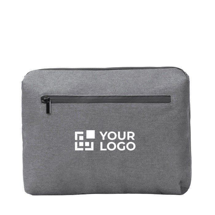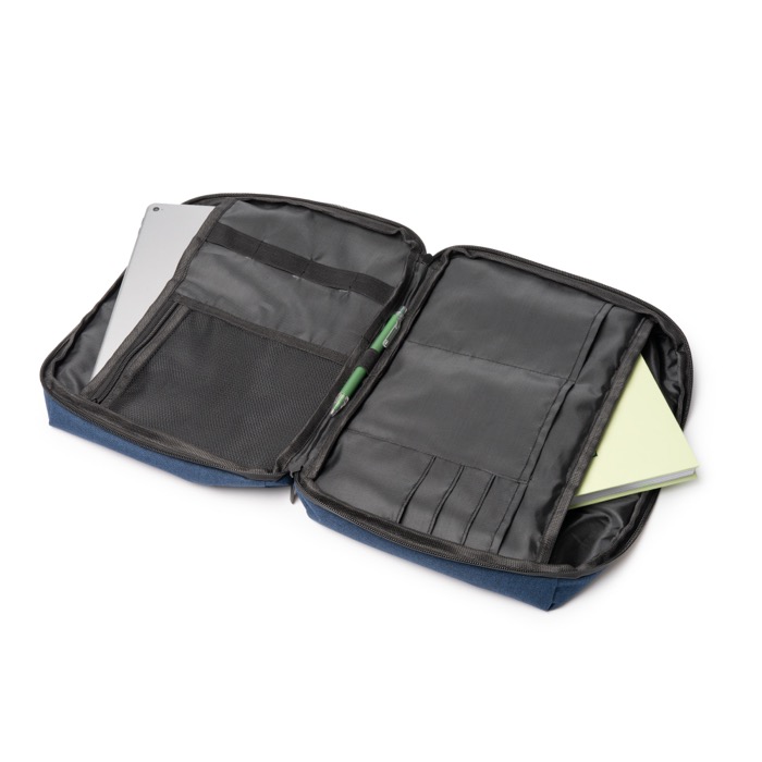 Laptophoes van gerecycled plastic met 300D-afwerking en kunststof details, geschikt voor apparaten tot 12''. Met twee interne compartimenten en volledig openritsbaar, zodat je je dag snel en overzichtelijk organiseert. De ritsen en stof zijn waterafstotend, handig tijdens verplaatsingen en in de stad. Met extra middelgrote en kleine vakken, een meshvak met rits en elastische banden om accessoires vast te zetten. Ook met een ruim buitenvak met sluiting. Een praktische optie voor trainingen, events en een zakelijke welkomstset.
