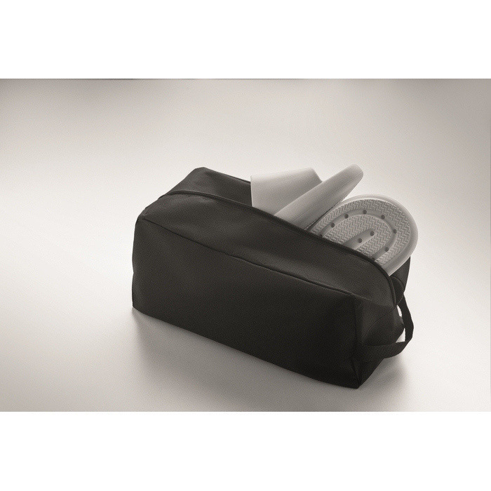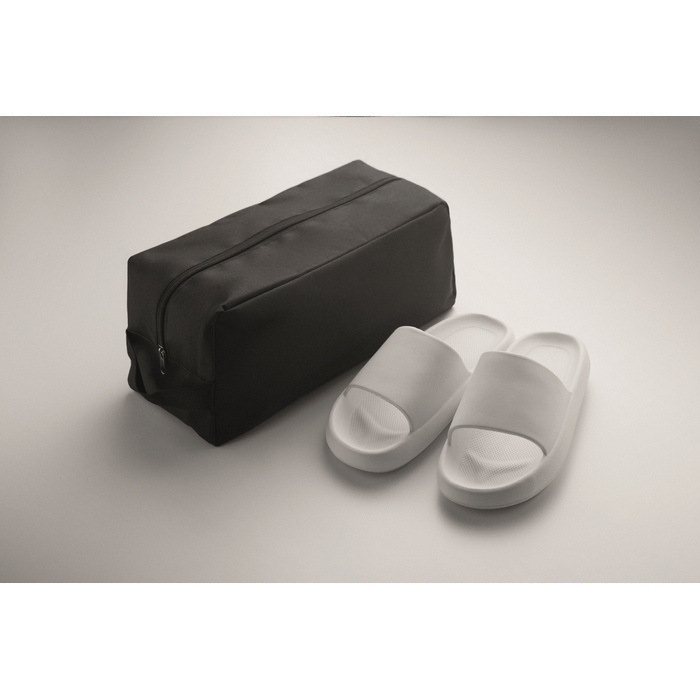 Schoenentas van RPET-polyester 600D, ontworpen om schoenen te vervoeren en te scheiden van de rest van de bagage. Voorzien van een rits voor snelle toegang en een veilige sluiting, en een zijhandgreep die het dragen of hanteren in kluisjes en kofferruimtes vergemakkelijkt. De 600D-stof biedt goede weerstand tegen dagelijks gebruik en helpt de vorm te behouden. Praktische optie voor uitrustingen, zakenreizen of welkomstpakketten voor medewerkers en deelnemers aan evenementen.