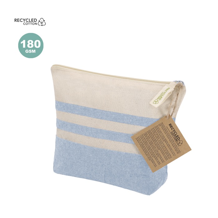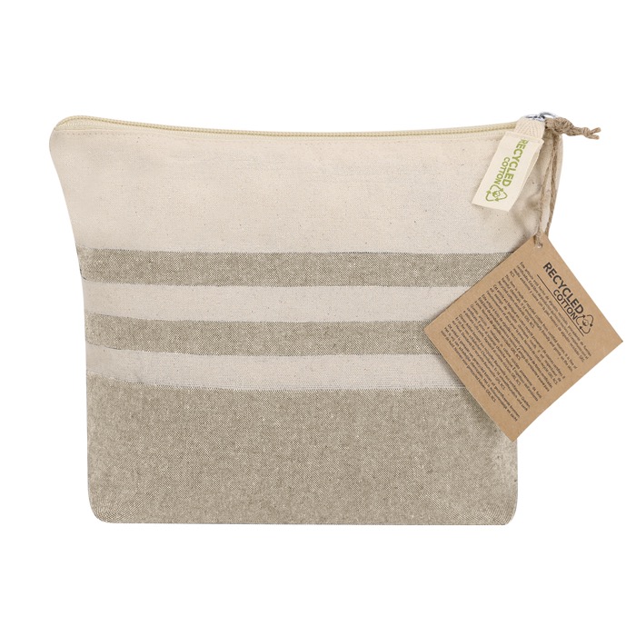 Toilettas, grotendeels gemaakt van gerecycled katoen 180 g/m², in een naturel tint en met horizontale strepen voor een verzorgde uitstraling. Hij heeft een hoofdvak met ritssluiting om de inhoud netjes en binnen handbereik te houden. Er zit een buitenlabel op met het logo van gerecycled katoen, handig om de herkomst van het materiaal te laten zien. Door het formaat is hij praktisch voor reisbenodigdheden, kantoorartikelen of kleine accessoires bij welkomstacties, beurzen en bedrijfsevenementen.
