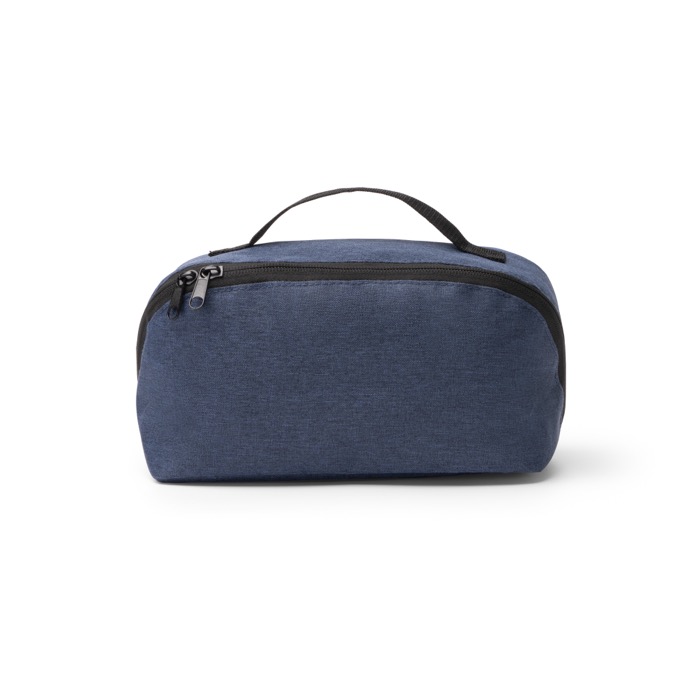 Toilettas van gerecycled plastic met 600D-stof en een diagonale ritssluiting. Bedoeld om accessoires en producten voor reizen of werk te organiseren. Het hoofdvak opent 180°, zodat je alles meteen ziet en erbij kunt zonder te moeten zoeken. Er zit een aparte binnenzak met rits in die als scheiding dient, plus een extra meshvak met elastische afstelling voor kleine items. Met de draaglus neem je hem makkelijk mee tussen kantoor, events of teamreizen.