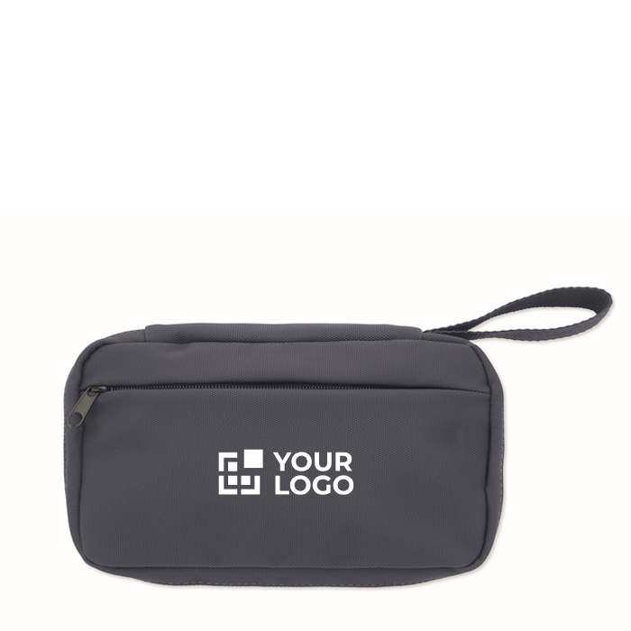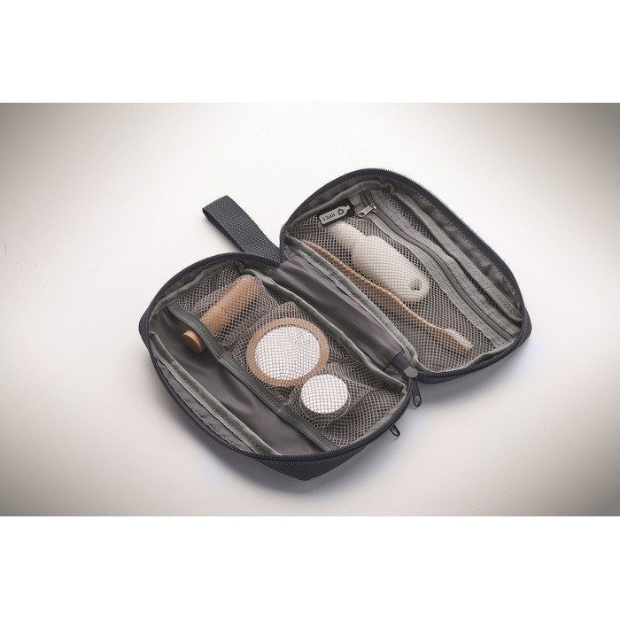 Toilettas van RPET 600D met PU-coating, RPET-mesh en RPET 210D-voering, ontworpen om reisartikelen of spullen voor dagelijks gebruik te organiseren. De tas heeft een hoofdvak met rits om de inhoud veilig af te sluiten. Binnenin zitten mesh en meerdere open vakken die helpen kleine accessoires te scheiden en alles zichtbaar te houden. Door het formaat is dit een geschikt relatiegeschenk voor welkomstpakketten, evenementen of merchandisingacties.