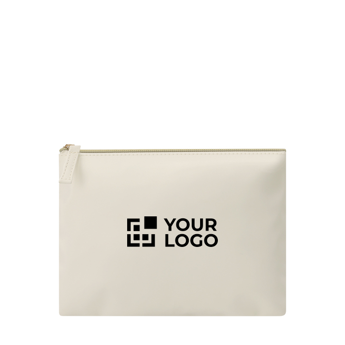 Toilettas van kunstleer met een nette afwerking, bedoeld om kleine accessoires dagelijks te organiseren. Hij heeft een ruim hoofdvak en een ritssluiting die de inhoud helpt beschermen, met een treklip om snel te openen en te sluiten. Het compacte formaat maakt hem makkelijk mee te nemen in een aktetas, rugzak of reistas zonder te veel ruimte in te nemen. Het oppervlak is geschikt om te bedrukken met het bedrijfslogo, zodat je merk dagelijks zichtbaar blijft. Aanbevolen voor HR-acties, beurzen of de onboarding van nieuwe medewerkers.