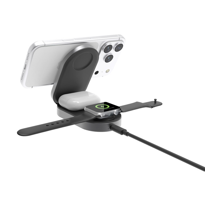 - Opvouwbare 3-in-1 oplader voor telefoon, horloge en oordopjes