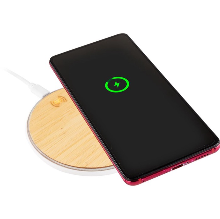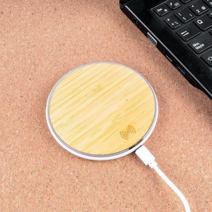 5W draadloos oplaadstation met bamboe hoes. Super als promotieartikelen.