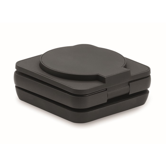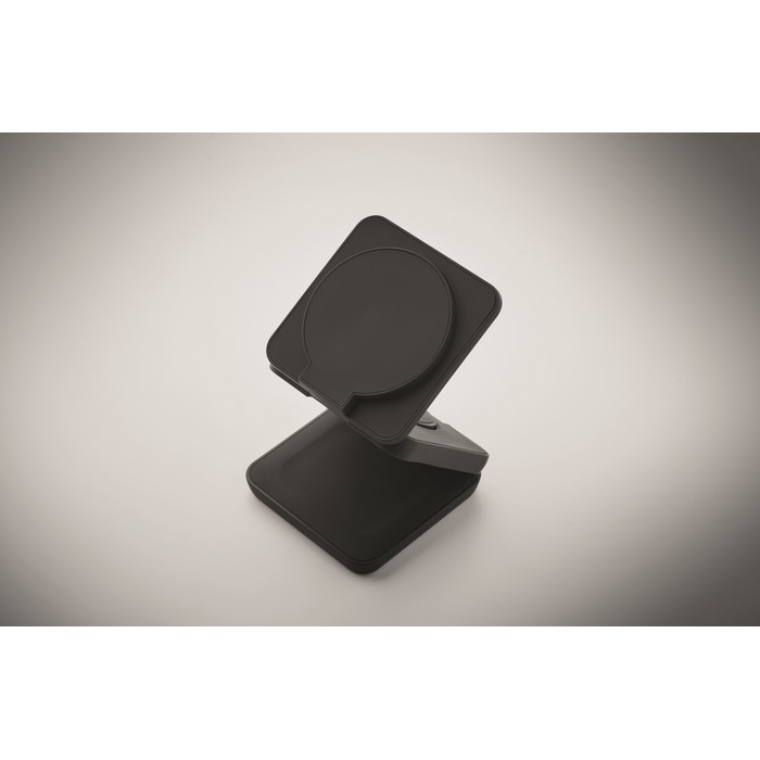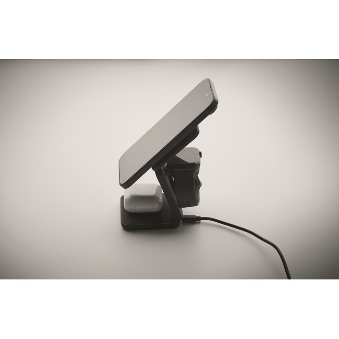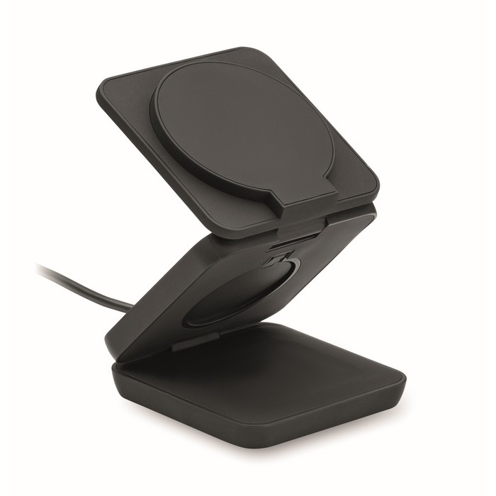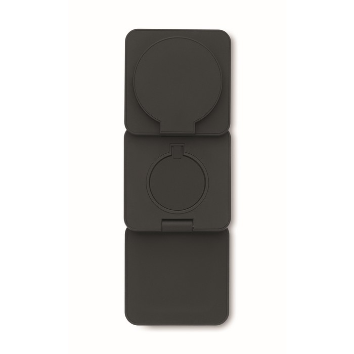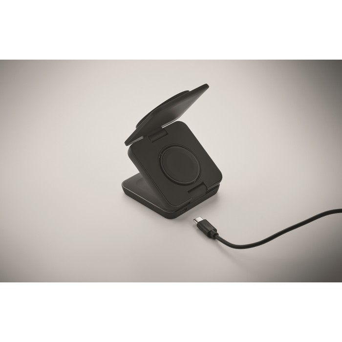 3-in-1 opvouwbaar oplaadstation van gerecycled ABS met rubber. Het omvat een magnetische draadloze oplader van 15W, een smartwatch-oplader (alleen Apple®) en een TWS-oplader.