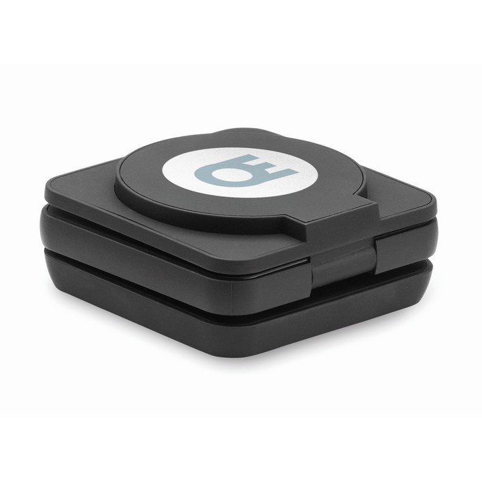 Opvouwbare oplader waarmee je drie apparaten tegelijk kunt opladen, ook bruikbaar als standaard. Inclusief snelle oplaadkabel en extra magnetische ring.