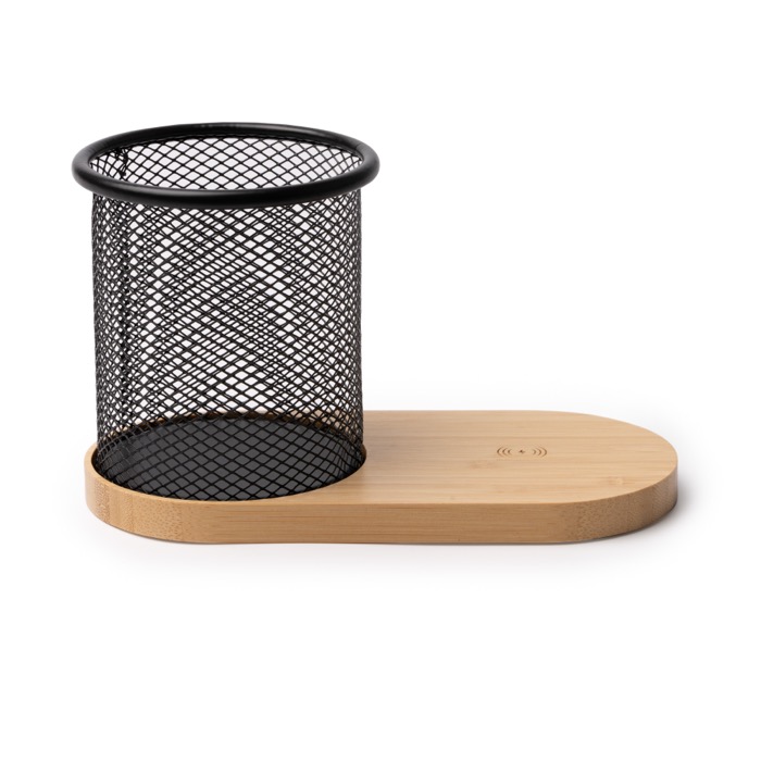Metalen multifunctionele pennenhouder met rasterdesign en bamboe basis met geïntegreerd draadloos opladen voor compatibele apparaten. Zo houd je je bureau netjes terwijl je je mobiel oplaadt, zonder zichtbare kabels. Hij levert tot 15W voor stabiel opladen in het dagelijks gebruik en bevat een Type C-aansluitkabel om hem eenvoudig op je apparatuur of adapter aan te sluiten. Een praktische optie om te geven bij bedrijfsevenementen, onboarding of als kantoordetail met je logo.