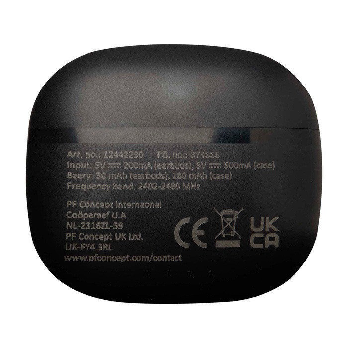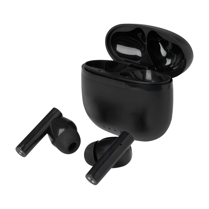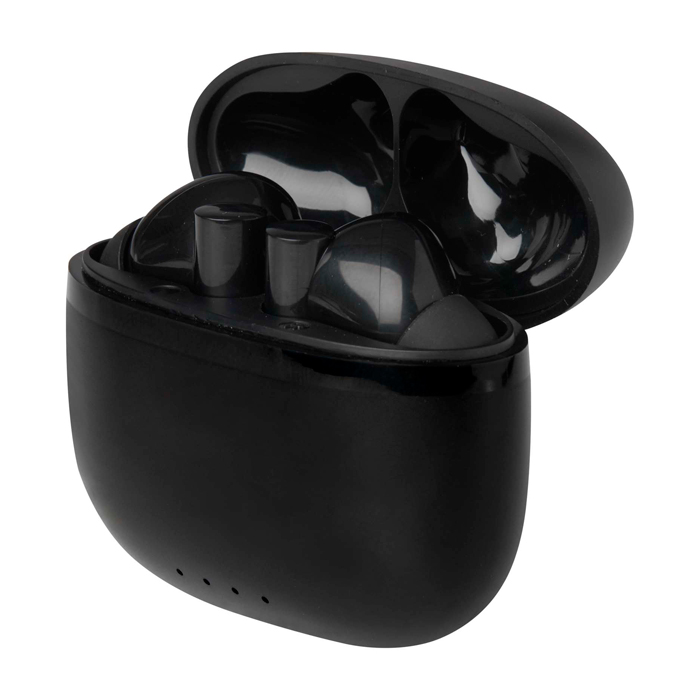 TWS-oordopjes van gerecycled plastic met Bluetooth®-connectiviteit, bedoeld voor draadloze gesprekken en muziek in het dagelijks gebruik. Ze hebben siliconen oordopjes die zorgen voor een comfortabele en stabiele pasvorm en worden opgeborgen in een compacte oplaadcase om ze makkelijk mee te nemen. Ze bieden tot 4 uur afspelen of bellen en laden in ongeveer 1 tot 1,5 uur weer op. Inclusief type-A-naar-type-C-oplaadkabel van 30 cm. Handig voor merkacties op events en als relatiegeschenk.