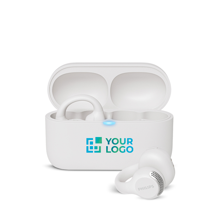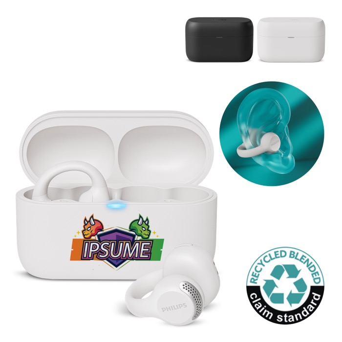 Open-ear oordopjes gemaakt van RCS-gecertificeerde gerecyclede materialen. Bedoeld om naar muziek te luisteren zonder te missen wat er om je heen gebeurt. Ze bieden tot 7 uur afspelen en halen 28 uur met het laadcase, handig voor dagelijks gebruik onderweg of op kantoor. De zweet- en spatbestendigheid met IPX4-certificering helpt de prestaties op peil te houden tijdens actieve routines. Een praktische optie voor merkacties bij events, trainingen of interne geschenken met een technologische insteek, van Philips.