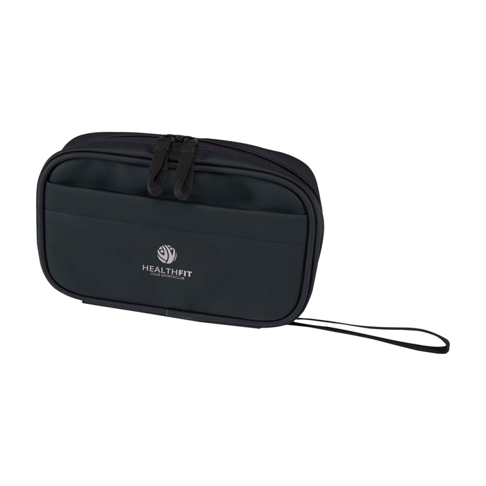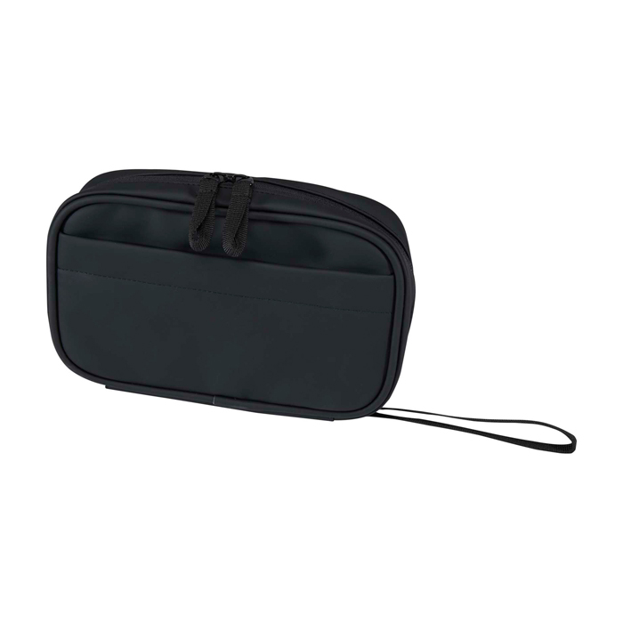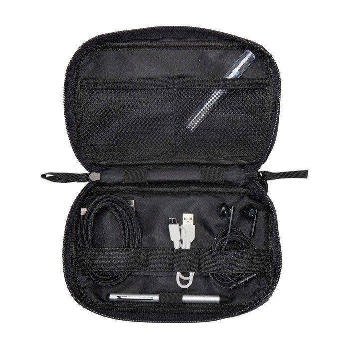Technologische organizer van gerecycled kunstleer met bijpassende voering van gerecycled kunststof. Ontworpen om accessoires netjes geordend te houden tijdens reizen of hybride werkdagen. Het hoofdvak met rits heeft een elastische pennenlus, twee meshvakjes voor oordopjes en kleine items, een verstevigde verdeler en meerdere elastische banden voor kabels, USB-sticks en opladers. Aan de buitenkant zit een voorvak met klittenband en een draaglus van band. De waterbestendige coating helpt de inhoud te beschermen tijdens verplaatsingen en merkacties.
