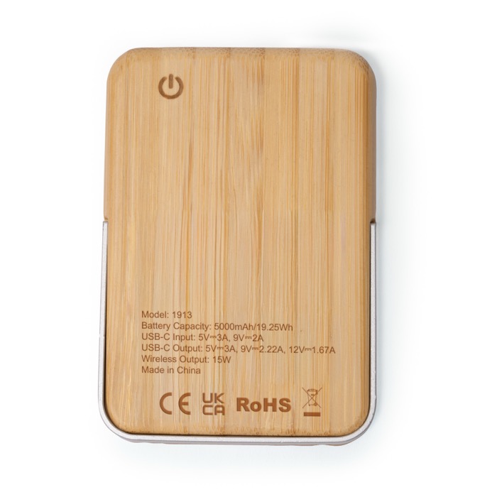 Powerbank met een behuizing van bamboe en een opklapbare verticale standaard van gerecycled aluminium, gemaakt om op je bureau of onderweg zonder gedoe op te laden. Heeft een magnetische draadloze oplader voor compatibele telefoons en levert tot 15W, zodat je kunt opladen zonder kabels wanneer je het nodig hebt. Met een lampje waarmee je het laadniveau in één oogopslag ziet. Inclusief USB-C-kabel om de powerbank op te laden of apparaten van stroom te voorzien. Handig voor branding op beurzen, events of als welkomstgeschenk voor medewerkers.