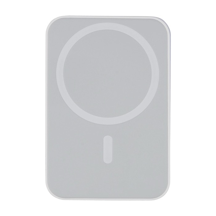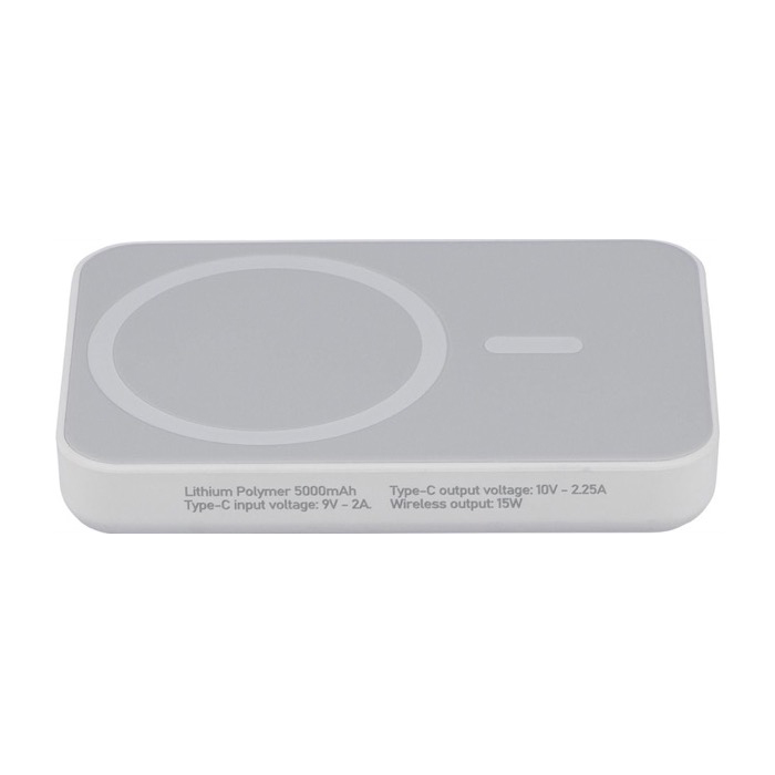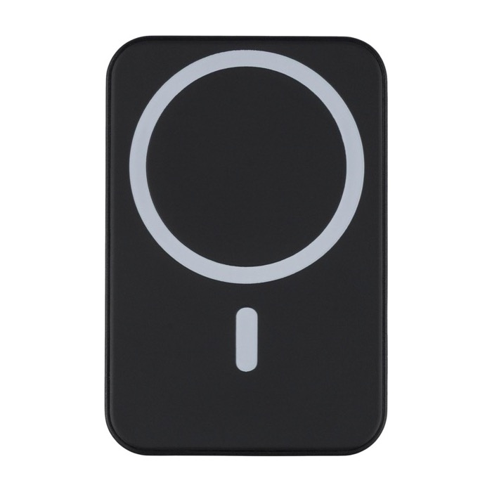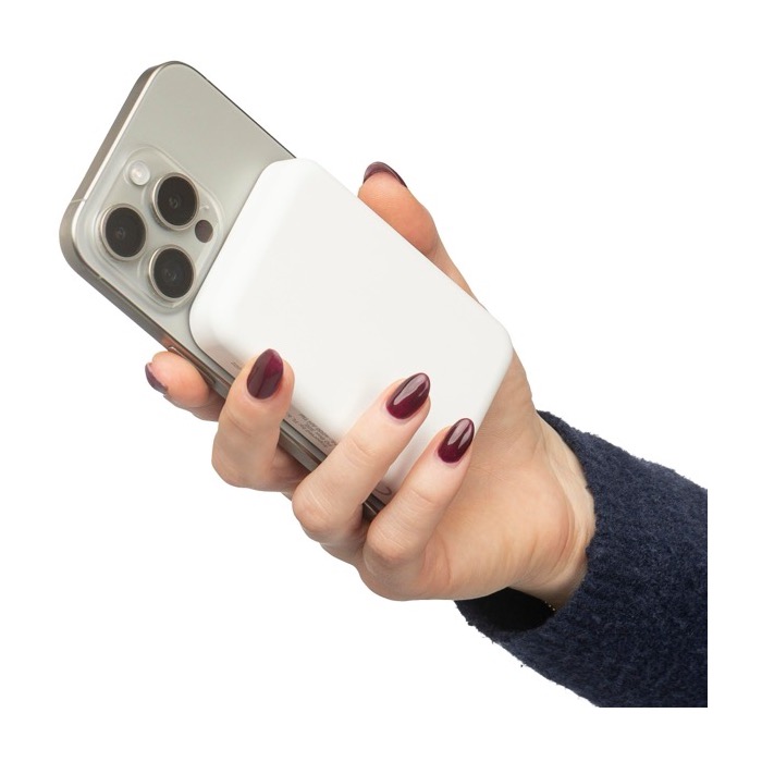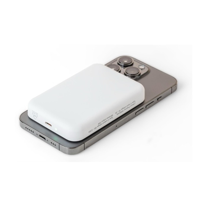 Powerbank van gerecycled plastic met een lithium-ionbatterij van 5000mAh en magnetisch draadloos opladen van 15W, compatibel met MagSafe. Voorzien van een USB-C-ingang (Universal Serial Bus type C) tot 20W en een USB-C-uitgang met meerdere laadprofielen, zodat hij past bij verschillende apparaten. Met beveiliging tegen oververhitting, kortsluiting, overspanning en overladen, en stopt automatisch met laden als de temperatuur stijgt. Inclusief metalen plakring voor apparaten zonder MagSafe. Een praktische optie voor merkacties op beurzen, verkoopmomenten en corporate onboarding.