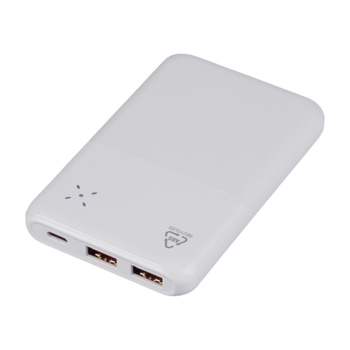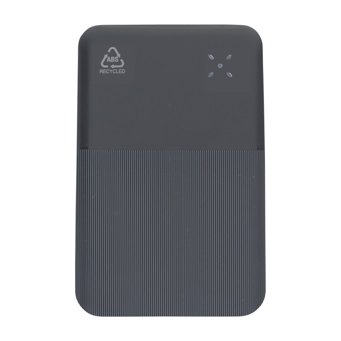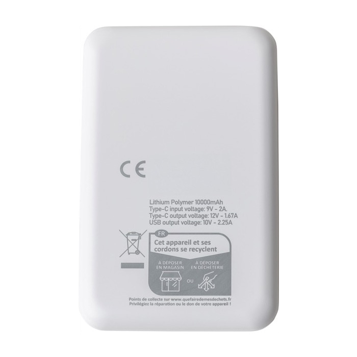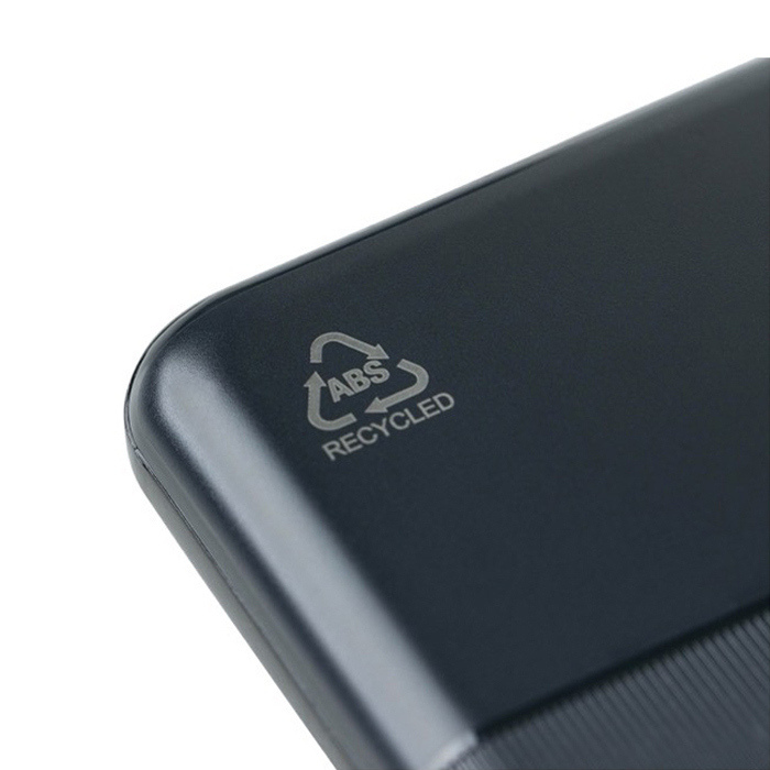 Powerbank van gerecycled kunststof met een lithium-ionbatterij van 10000mAh en snelladen van 22,5W, voor intensieve werkdagen of reizen. Hij heeft een USB-C-in- en uitgang (USB type C) en een USB-A-ingang (USB type A). Zo is hij goed te gebruiken met gangbare kabels. De behuizing combineert een glad deel voor bedrukking met een getextureerd reli_x0000_f dat meer grip geeft. Bovenop zit een digitaal display om het laadniveau te zien. Ook zijn er beveiligingen tegen oververhitting, kortsluiting en overladen. Wordt geleverd in een individuele doos, handig voor corporate acties en evenementen.