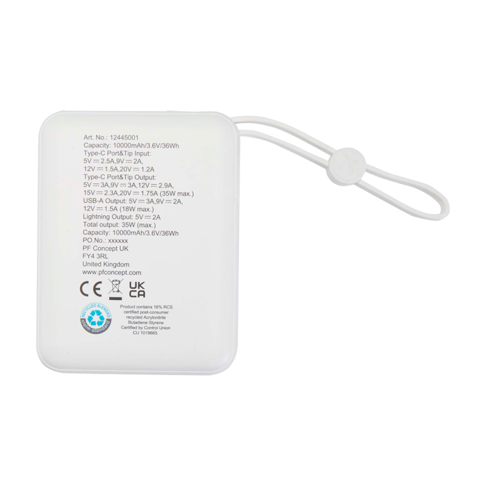 De Acrux 10.000 mAh powerbank is gemaakt van gerecycled plastic en is ontworpen om snel en handig op te laden, waar je ook bent. Hij heeft een 35 W USB-C in/uit-poort en een 18 W USB-A-poort, samen met een ingebouwde USB-C- en Lightning-kabel, zodat je je apparaten kunt opladen zonder dat je extra accessoires nodig hebt. Een digitaal display toont het oplaadpercentage in één oogopslag, zodat je gemakkelijk het batterijniveau kunt controleren. Perfect om smartphones en tablets de hele dag van stroom te voorzien.