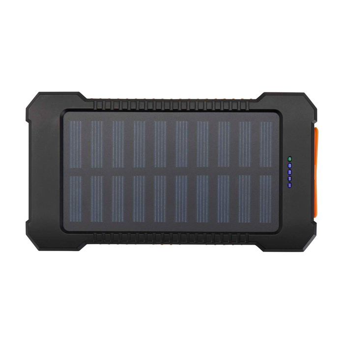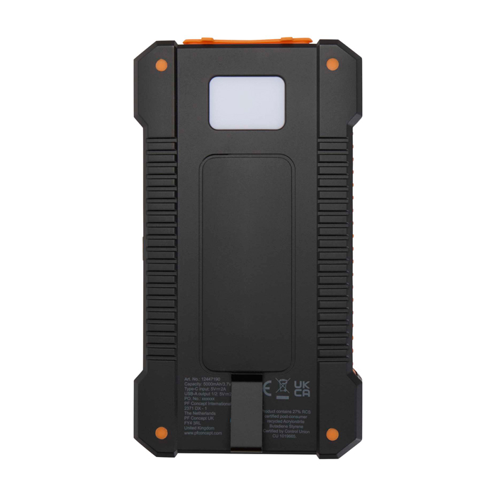 De Altair 5000 mAh powerbank op zonne-energie, gemaakt van gerecycled plastic, is gebouwd voor duurzaamheid en gemak. Het biedt twee USB-A-uitgangspoorten en een Type-C-in-/uitgangspoort voor flexibele oplaadopties. Ontworpen met een robuuste buitenkant, voorzien van een verwijderbare clip voor eenvoudige bevestiging, een ingebouwde zaklamp en connectoren die veilig zijn opgeborgen achter een siliconen kap. Met oplaadmogelijkheden op zonne-energie en een led-indicator die de oplaadstatus aangeeft, is deze powerbank de ideale metgezel voor buitenavonturen.