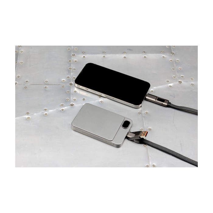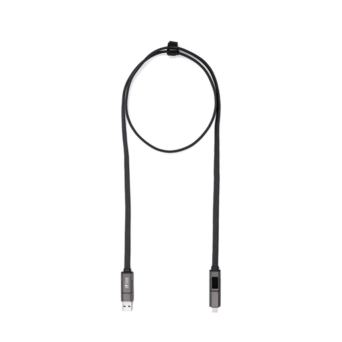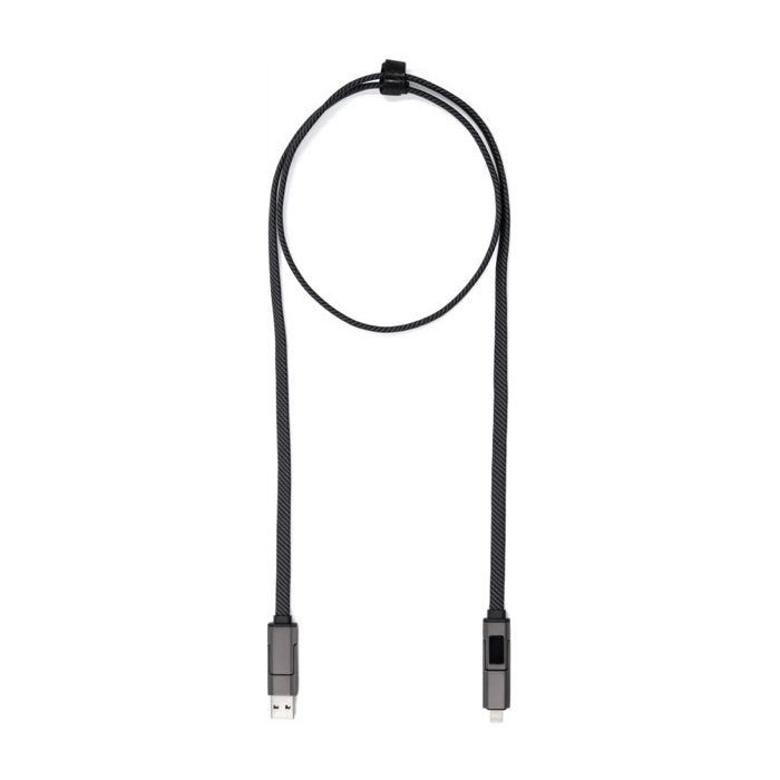 Kabel van 120 cm in gerecycled nylon met 4-in-1-ontwerp voor verschillende laad- en verbindingsbehoeften in het dagelijks gebruik. Met USB-C- en USB-A-ingangen en USB-C- en Lightning-uitgangen, zodat je meerdere apparaten met één kabel kunt bedienen. Ondersteunt snelladen tot 65W via USB-C naar USB-C en maakt ook USB 2.0-dataoverdracht mogelijk. Wordt geleverd zonder individuele verpakking, bedoeld voor intensief gebruik op kantoor, bij events of als merkdrager bij corporate acties.