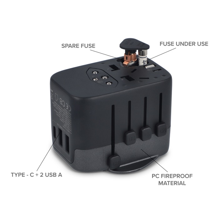 Reis zorgeloos naar meer dan 150 landen met deze compacte en veilige adapter, een onmisbaar item om je apparaten altijd opgeladen te houden.