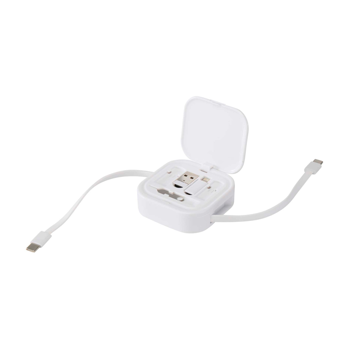 De Gloas is je alles-in-één oplaad- en smartphonetool, vervaardigd van gerecycled plastic. Hij beschikt over een intrekbare 100 W USB-C-kabel voor snel opladen en gegevensoverdracht, een USB-A-adapter en een 2-in-1 microUSB-/Lightning-adapter. Krachtig genoeg om de meeste laptops, tablets en smartphones snel op te laden, en compatibel met zowel CarPlay als Android Auto. Binnenin vind je een pin voor het uitwerpen van simkaarten, opbergruimte voor een sim en microSD-kaart, plus een ingebouwde telefoonstandaard. Ideaal om eenvoudig video’s te bekijken of videogesprekken te voeren. Alles wat je nodig hebt in één compact ontwerp.