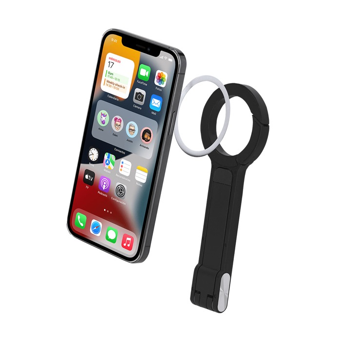 Multifunctionele opvouwbare magnetische houder van kunststof met matte afwerking, bedoeld voor dagelijks gebruik op kantoor en onderweg. Hij heeft een uitklapbare basis waarmee je de hoogte kunt verstellen, zodat je de kijkhoek aanpast aan je werkplek of taak. Bovenaan zit een karabijnhaak, zodat je hem makkelijk kunt meenemen of vastmaken aan een rugzak, badge of sleutelhanger. Praktische optie voor merkacties op beurzen, interne training of als relatiegeschenk.
