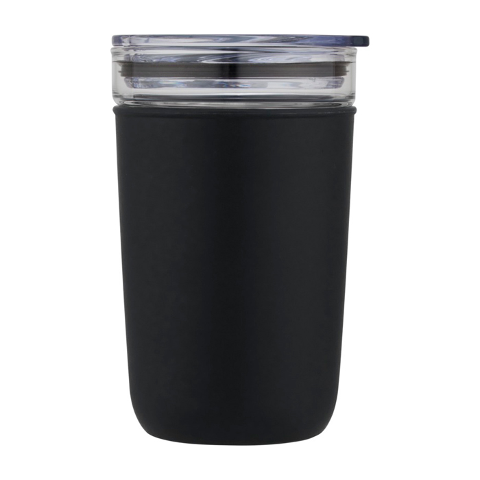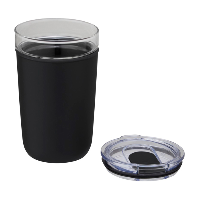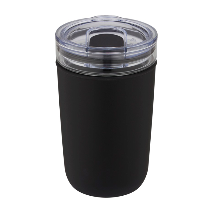 Glazen beker met logo, welke wordt beschermd door een hoes van gerecycled plastic. De beker is gemaakt van 100% duurzaam borosilicaatglas dat de versheid van de drank behoudt en hij bevat geen schadelijke chemicaliën. BPA-vrij, getest en goedgekeurd volgens de Duitse voedselveiligheidswetgeving (LFGB). Getest en goedgekeurd voor ftalaten volgens de REACH-regelgeving. De beker past onder de meeste koffiemachines. Inhoud 420 ml Door de plastic hoes te verwijderen, is het artikel vaatwasmachinebestendig. Geleverd in een gerecycled kartonnen geschenkverpakking.