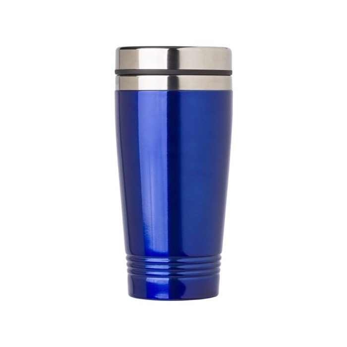 Roestvrijstalen mok (450 ml), dubbelwandig, met deksel. Deksel heeft een schuifopening om uit te drinken. Anti-slip onderkant. Individueel verpakt in kartonnen verpakking.