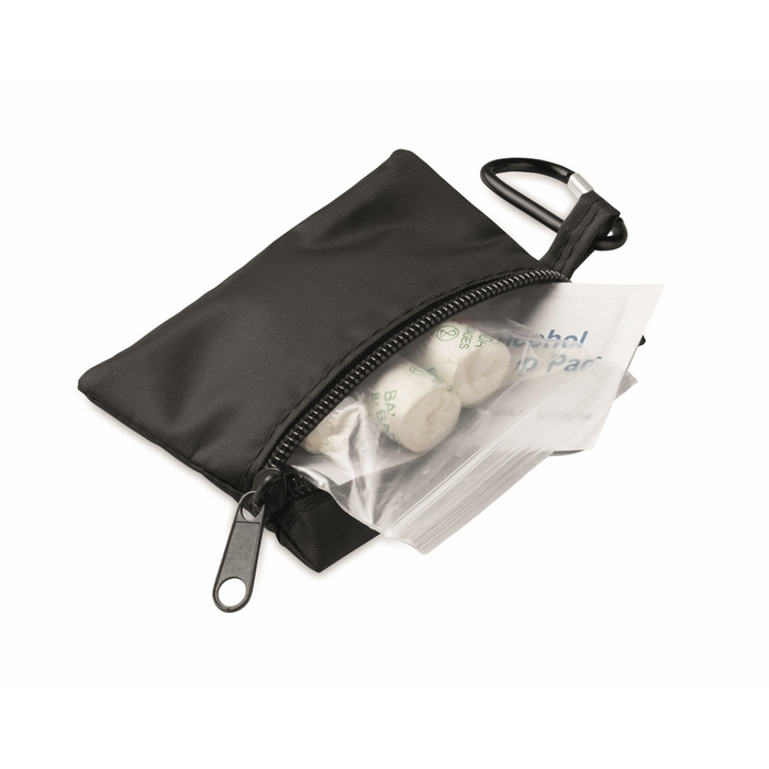 - Compacte EHBO-set in RPET-tasje met karabijnhaak