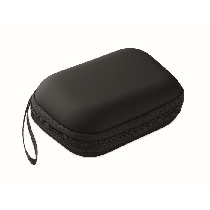 EHBO-kit in harde PU-etui, ontworpen om de inhoud beschermd en overzichtelijk te houden. Bevat 2 handschoenen, 1 deken, 1 pleistertape, 2 zwachtels, 1 schaar, 4 wattenstaafjes, 10 pleisters en 6 doekjes, waarmee basisbehoeften bij kleine incidenten worden gedekt. Compact formaat en eenvoudig op te bergen in een lade, voertuig of gemeenschappelijke ruimte. Verkoop niet beschikbaar buiten de EU. Geschikt voor bedrijfskits, recepties of preventieacties binnen het bedrijf.