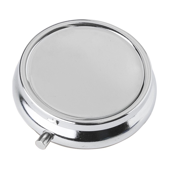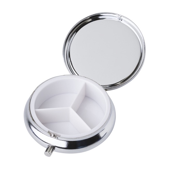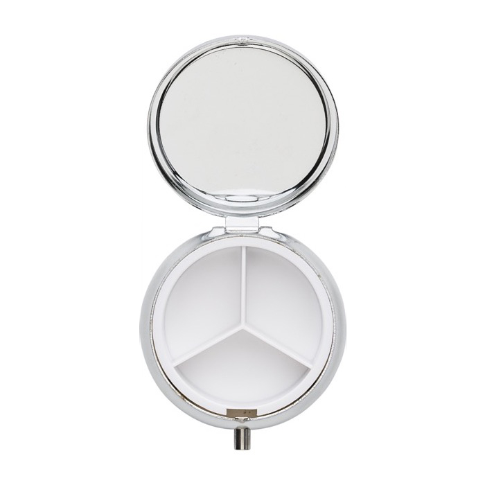 IJzeren pillendoosje en PP binnenzijde met 3 compartimenten. Glanzende binnenkant kan als spiegel gebruikt worden. Individueel verpakt in een witte doos.