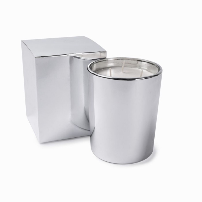 Geurkaars met drie lonten in metalen houder, 500 g was en bloemengeur. Geleverd in elegante doos.