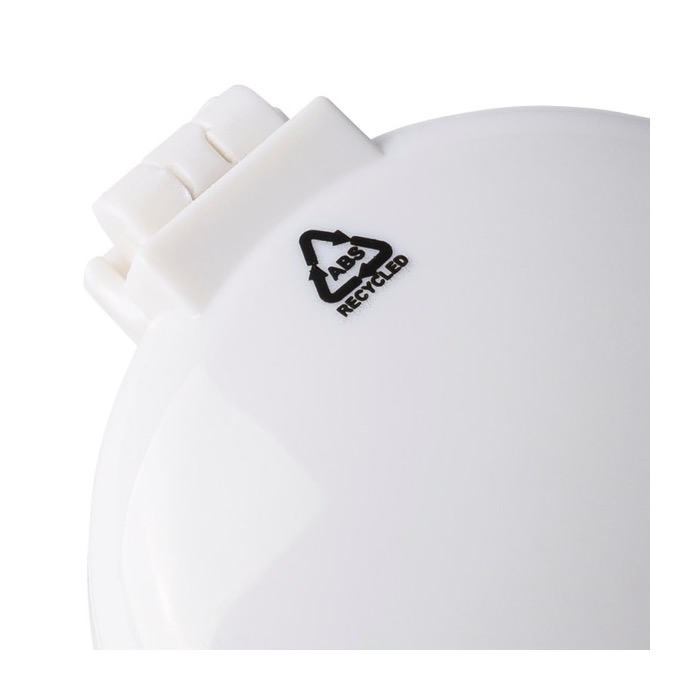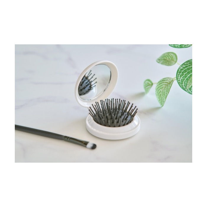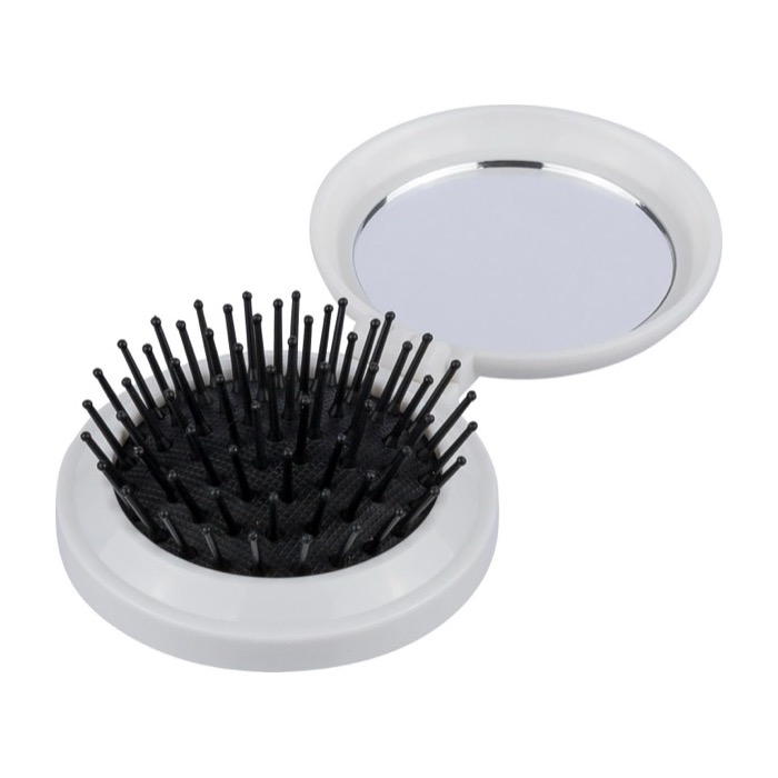 Etui van gerecycled kunststof met geïntegreerde borstel en spiegel. Bedoeld om er verzorgd uit te zien tijdens verplaatsingen, beurzen of zakenreizen. Het compacte formaat past makkelijk in handtas, rugzak of toilettas en neemt bijna geen ruimte in. Wordt geleverd in een individuele plastic zak voor een nettere verwerking in magazijn en distributie. Een praktische optie voor HR-acties, congressen of relatiegeschenken met personalisatie.