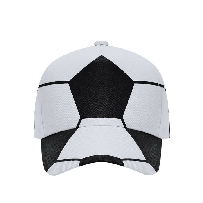 Sportpet van katoen met een ontwerp geïnspireerd op een voetbal en een constructie met 5 panelen voor een evenwichtige pasvorm. Met verstelbare klittenbandsluiting achteraan, zodat hij snel op verschillende maten past. De stof voelt prettig aan en is geschikt voor langdurig gebruik tijdens buitenactiviteiten, sportevenementen of straatacties. Oppervlak klaar voor bedrukking met logo voor zichtbaarheidscampagnes, bedrijfskleding of merchandising voor toernooien en sponsoring.