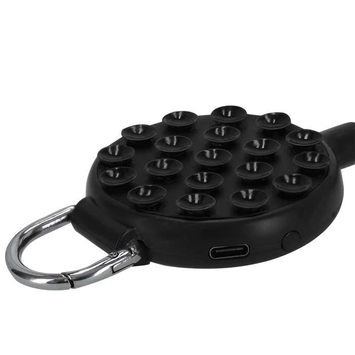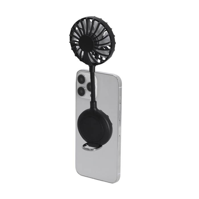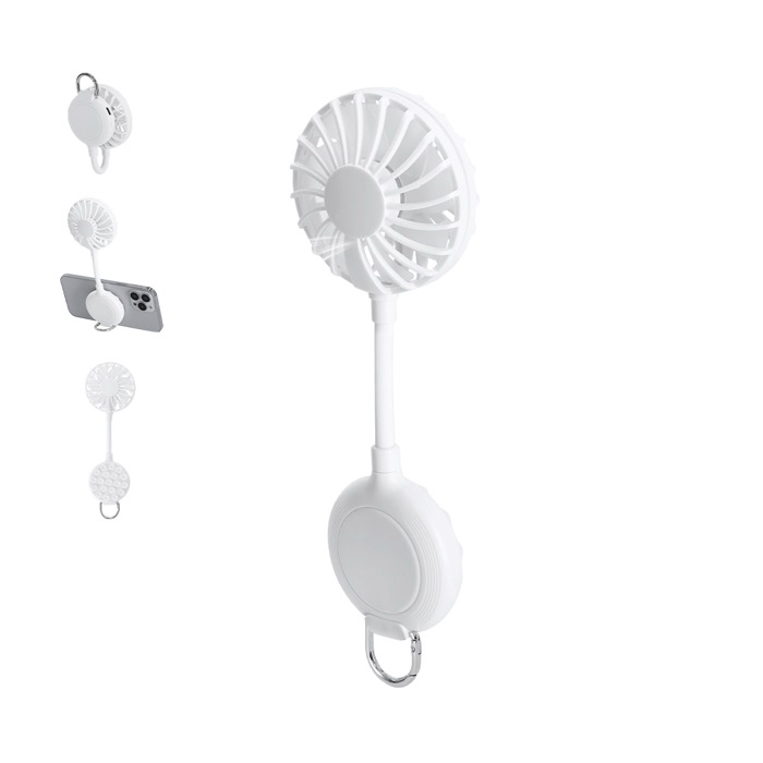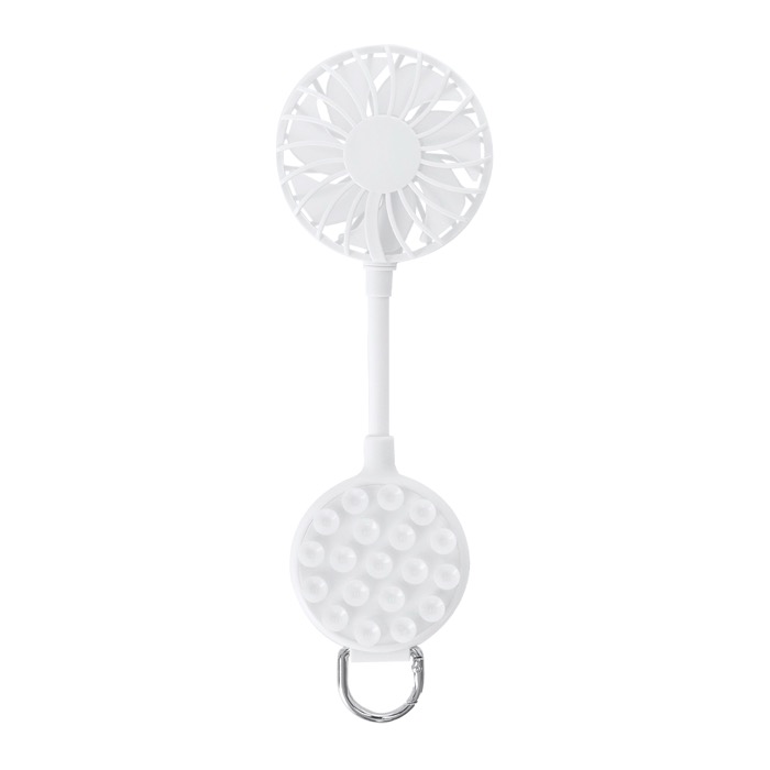 Multipositieventilator van kunststof in effen kleur, met 360°-draaiing zodat je de luchtstroom aanpast aan elke situatie. Met zuignap om je mobiel vast te zetten en een verstelbare standaard om het apparaat stabiel op een tafel of gladde oppervlakken te plaatsen. Heeft 3 snelheden die je met een knop instelt, een oplaadbare batterij en een bijpassende USB A-naar-USB C-oplaadkabel. Aan de basis zit een karabijnhaak met metalen ring om hem op te hangen. Handig voor merkacties op events en op kantoor.