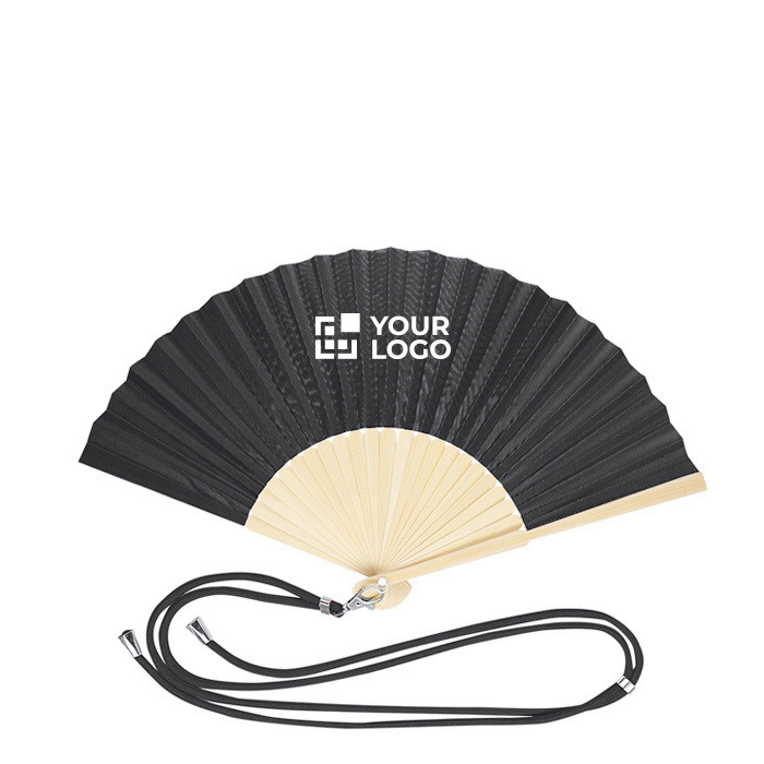 Stevige polyester waaier met flexibele bamboe spijlen, bedoeld om mee te nemen en dagelijks te gebruiken op warme dagen. Met een bijpassend verstelbaar koord, zodat je hem bij de hand houdt en minder snel kwijtraakt tijdens events of onderweg. Groot oppervlak om te bedrukken met logo, handig voor beurzen, zomercampagnes of welkomstacties op kantoor.